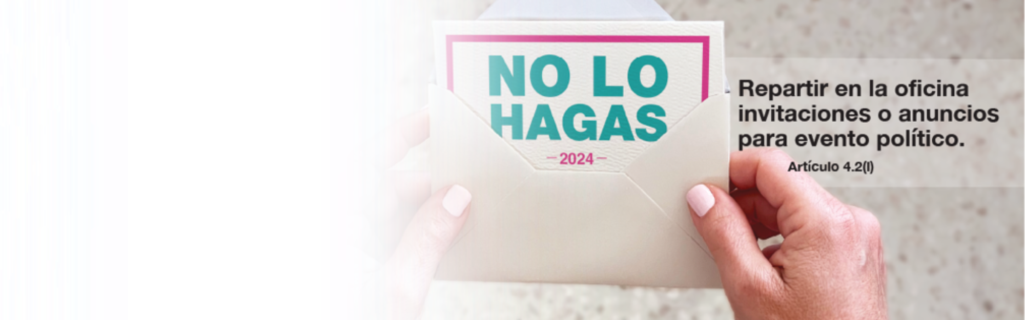 Un servidor público no puede, mientras se encuentra en funciones de su trabajo, utilizar en su persona, su propiedad o en cualquier propiedad bajo su custodia algún símbolo, lema, imagen, fotografía, pin, logo, pegatina, calcomanía, rótulo, insignia, aplicación tecnológica, mensaje escrito u otro distintivo que identifique o promueva, directa o indirectamente, los intereses electorales de cualquier partido o candidato político.