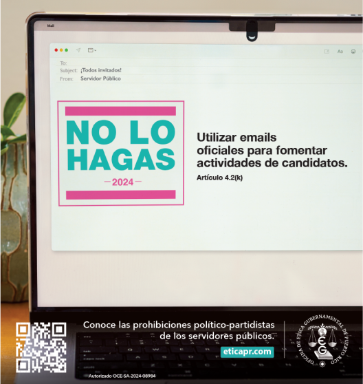 Un servidor público no puede utilizar, en los bienes muebles o inmuebles del Gobierno, cualquier símbolo, lema, imagen, fotografía, pin, logo, pegatina, calcomanía, rótulo, insignia, aplicación tecnológica, mensaje escrito u otro distintivo que identifique o promueva, directa o indirectamente, los intereses electorales de cualquier partido o candidato político.